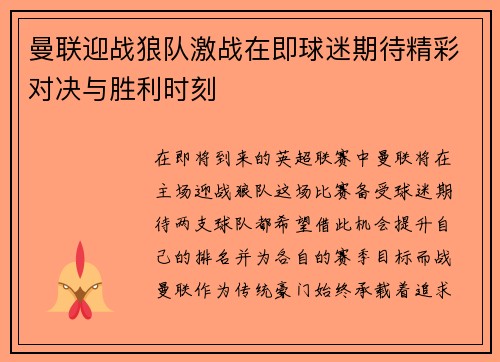 曼联迎战狼队激战在即球迷期待精彩对决与胜利时刻